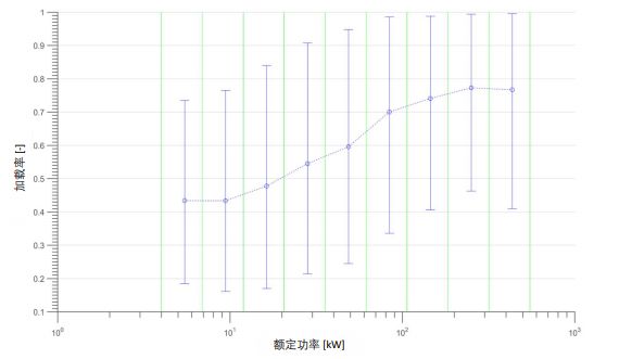 圖 2 顯示了按額定功率分組的年運(yùn)行時(shí)間。很明顯,藍(lán)圈標(biāo)識(shí)的平均年運(yùn)行時(shí)間相對 較少,從所有分組(由綠色豎線分隔)看,該平均值是介于 2,804 - 4,703 小時(shí)之間(見表 1)。另外,一個(gè)明顯趨勢是額定功率越大運(yùn)行時(shí)間越長,但是超過 100kW 之后則趨于穩(wěn) 定。另外,八分之一和八分之七所覆蓋的范圍差別也是極大的,推測是因?yàn)榭蛻魬?yīng)用多變導(dǎo)致的。