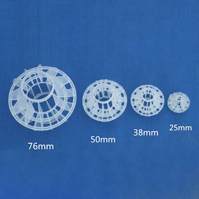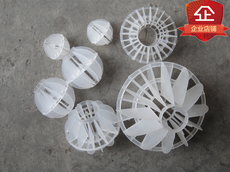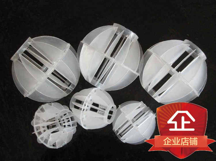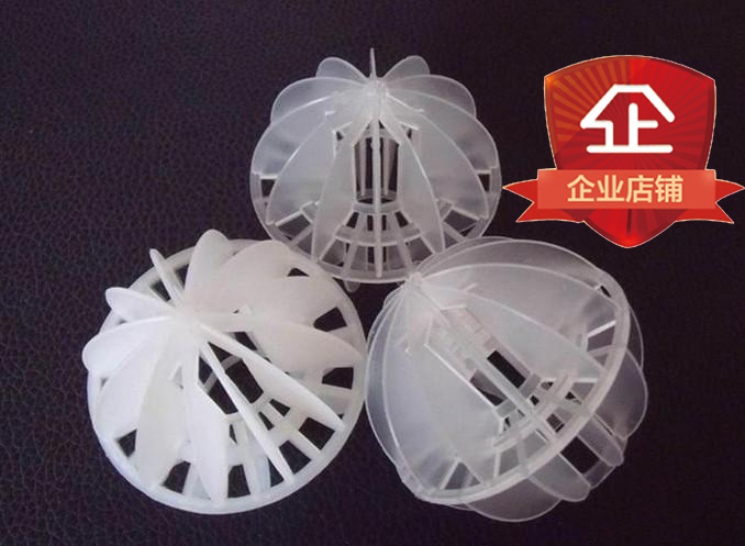 多面空心球采用聚丙烯(PP)塑料制成球狀,由兩個半球合成一個球形,兩個半球的扇形葉片相互錯開。該填料特點是比表面積大,空隙率較高。但是由于葉片數偏多,彼此間有遮蔽效應,不利于液體分布和潤濕;液體大多在球體空心柱聚集,阻礙氣體暢通,因此阻力較大。重量輕、強度高、自由空間大、耐高溫、耐腐蝕、表面親水性能好、風阻小、電耗少、比表面積大且適應多種溶劑的處理裝置。此種填料多用于水處理工程廣泛應用于除氯氣、除氧氣、除二氧化碳吸收塔、廢氣凈化塔、酸霧凈化塔等環(huán)保設備中。