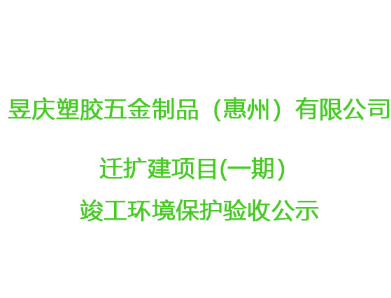 根據(jù)《國(guó)務(wù)院關(guān)于修改〈建設(shè)項(xiàng)目竣工環(huán)境保護(hù)管理?xiàng)l例〉的決定》(國(guó)務(wù)院令第682號(hào)),以及環(huán)保部《關(guān)于發(fā)布的公告》(國(guó)環(huán)規(guī)環(huán)評(píng)[2017]4號(hào)),現(xiàn)將昱慶塑膠五金制品(惠州)有限公司遷擴(kuò)建項(xiàng)目(一期)竣工環(huán)境保護(hù)驗(yàn)收內(nèi)容(包括驗(yàn)收?qǐng)?bào)告、驗(yàn)收意見(jiàn))。