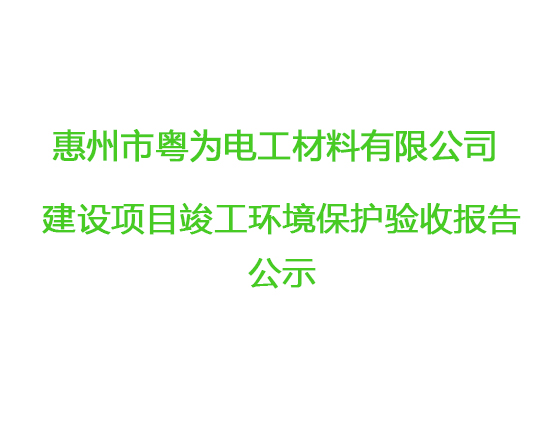 根據(jù)《國(guó)務(wù)院關(guān)于修改〈建設(shè)項(xiàng)目竣工環(huán)境保護(hù)管理?xiàng)l例〉的決定》(國(guó)務(wù)院令第682號(hào)),以及環(huán)保部《關(guān)于發(fā)布的公告》(國(guó)環(huán)規(guī)環(huán)評(píng)[2017]4號(hào)),現(xiàn)將惠州市粵為電工材料有限公司建設(shè)項(xiàng)目竣工環(huán)境保護(hù)驗(yàn)收內(nèi)容(包括驗(yàn)收?qǐng)?bào)告、驗(yàn)收意見(jiàn))公示如下: