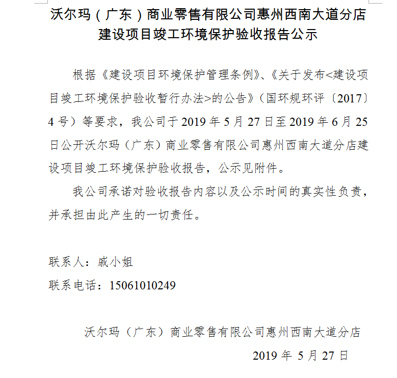 沃爾瑪(廣東)商業(yè)零售有限公司惠州仲愷大道分店 建設(shè)項(xiàng)目竣工環(huán)境保護(hù)驗(yàn)收?qǐng)?bào)告公示